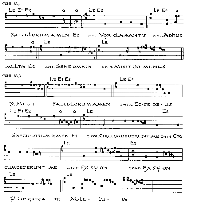 [CSMI:183,2; text: Le, E1, E2, a, Versus Misit, Saeculorum amen, introitus Ecce Deus, introitus Circumdederunt me, graduale Ex Syon, Versus Congregate, Alleluia]