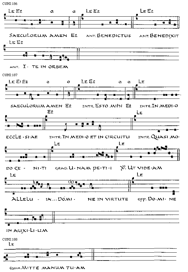 [CSMI:187; text: Le, E1, E2, a, Saeculorum amen, introitus Esto mihi, introitus In medio ecclesiae, introitus In medio et in circuitu, introitus Quasi modo geniti, graduale Unam petii, Versus Ut videam, Alleluia...Domine in virtute, offertorium Domine in auxilium]