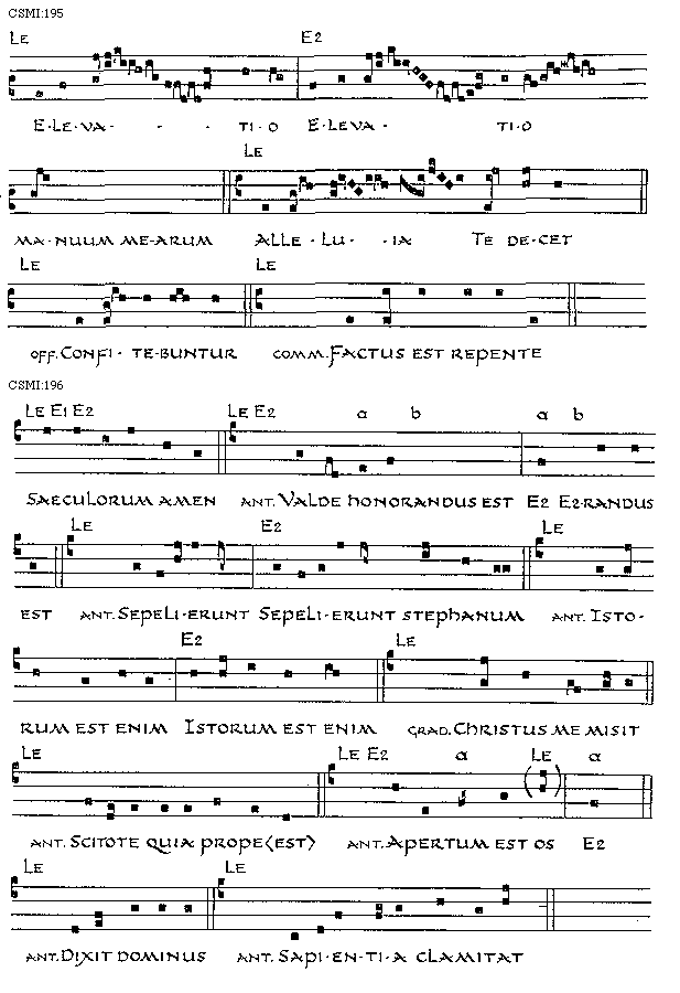 [195][CSMI:195; text: Le, E2, Elevatio, Elevatio manuum mearum, Alleluia Te decet, offertorium Confitebuntur, communio Factus est repente]