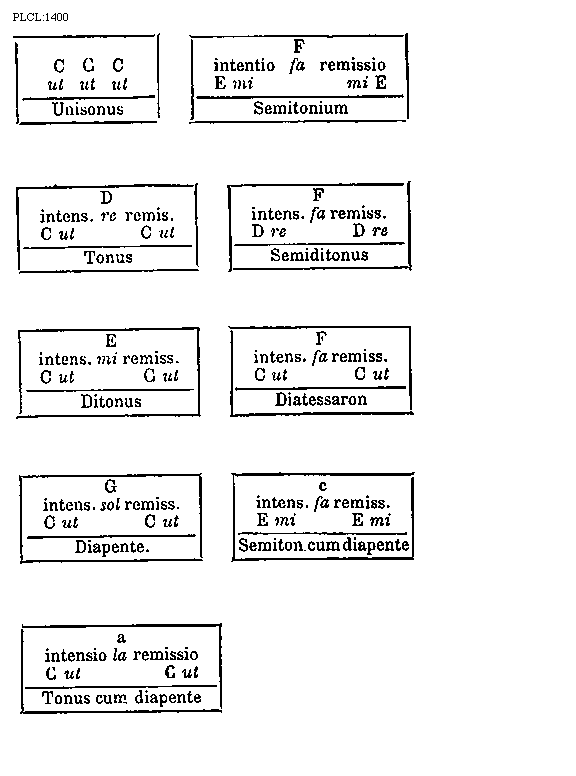 [PLCL:1400; text: C ut, D re, E mi, F fa, G sol, a la, c fa, intensio, remissio, intentio, Unisonus, Semitonium, Tonus, Semiditonus, Ditonus, Diatessaron, Diapente. Semitonium cum diapente, Tonus cum diapente]
