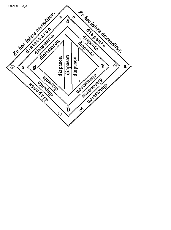 [PLCL:1401-2,2; text: Ex hoc latere ascenditur. Ex hoc latere descenditur. diatessaron, diapente, diapason, C, D, E, F, G, a, [sqb], c, d, e]