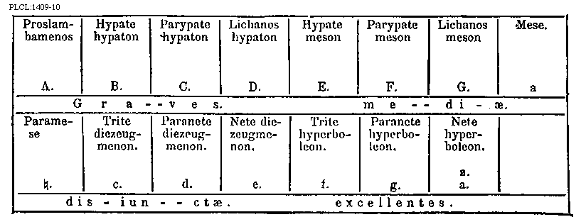 [1409][PLCL:1409-10; text: Proslambamenos, A. Hypate hypaton, B. Parypate hypaton, C. Lichanos hypaton, D. Hypate meson, E. Parypate meson, F. Lichanos meson, G. Mese. a, Graves. mediae. Paramese, [sqb]. Trite diezeugmenon. c. Paranete diezeugmenon. d. Nete diezeugmenon. e. Trite hyperboleon. f. Paranete hyperboleon. g. Nete hyperboleon. aa. disiunctae. excellentes.]
