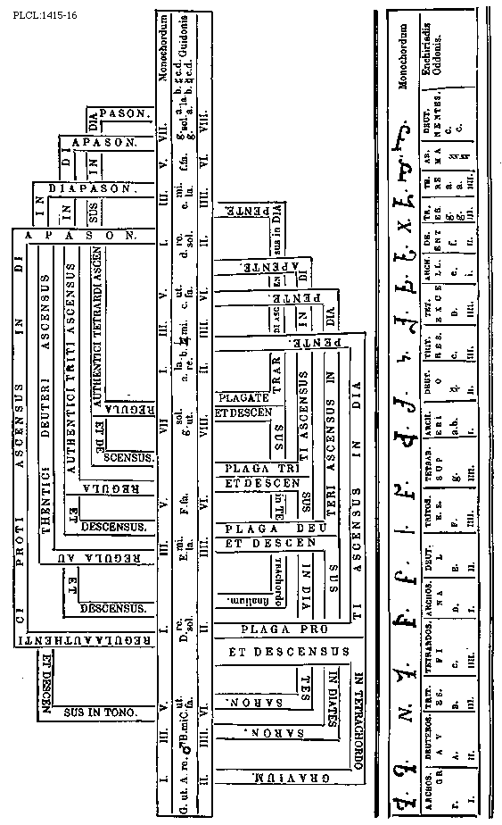 [1415][PLCL:1415-16; text: Regula authentici proti ascensus in diapason. et descensus in tono. Regula authentici deuteri ascensus in diapason. et descensus. Regula authentici triti ascensus in diapason. Regula authentici tetrardi ascensus in diapason. Plaga proti ascensus in diapente. et descensus in tetrachordo gravium. Plaga deuteri ascensus in diapente. et descensus in diatessaron. Plaga triti ascensus in diapente. Plaga tetrardi ascensus in diapente. et descensus in tetrachordo finalium. I. II. III. IIII. V. VI. VII. VIII. G.ut., A.re., B.mi, C.fa.ut., D.sol.re., E.la.mi., F.fa., g.sol.ut., a.la.re., b.[sqb]mi., c.fa.ut., d.sol.re., e.la.mi., f.fa., g.g.sol., a.a.la., b.b.[sqb][sqb], c.c., d.d. Monochordum Guidonis, Monochordum Enchiriadis Oddonis. Archos. Deuteros. Tritos. Tetrardos. Graves. Finale.s. Superiores. Excell.entes. Remanentes. [Gamma].]