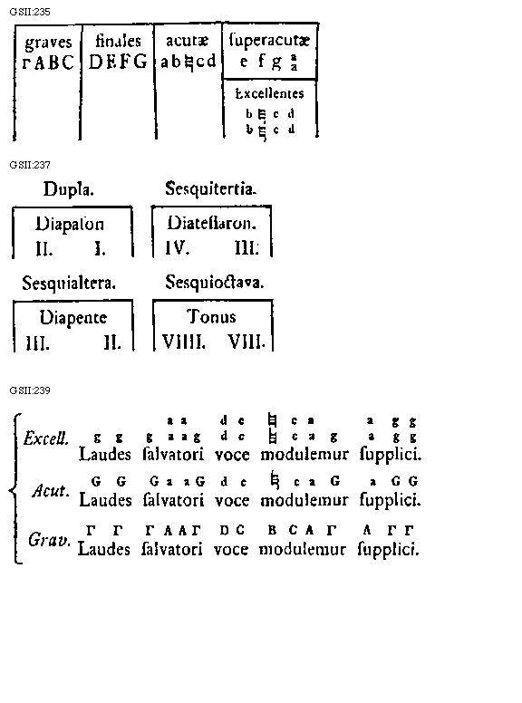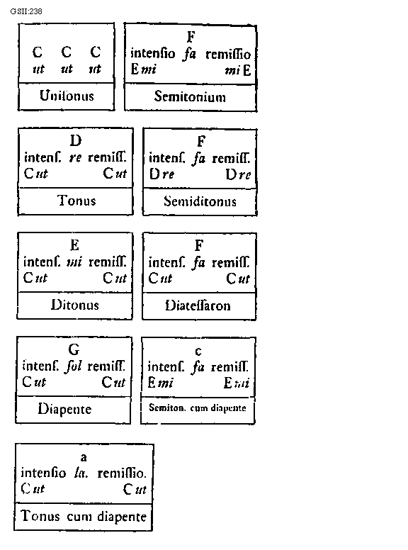 [GSII:238; text: C ut, Unisonus, F fa, intensio, remissio, E mi, Semitonium, D re, Tonus, Semiditonus, Ditonus, Diatessaron, G sol, Diapente, c fa, Semitonium cum diapente, a la, Tonus cum diapente]