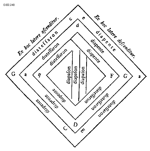 [240]Nonnulli etiam diapason consonantiam vocant vel propter proportionem, vel quia in prima et octava consonam reddit modulationem, vel etiam quia ex consonantiis constat, siquidem diatessaron et diapente constituunt diapason, praesertim cum inter primam et octavam vocem vel inferius diatessaron, et diapente superius, vel e converso habeatur, ut inter C et c, inter D et d, inter E et e, quod in hac figura considerare potes.