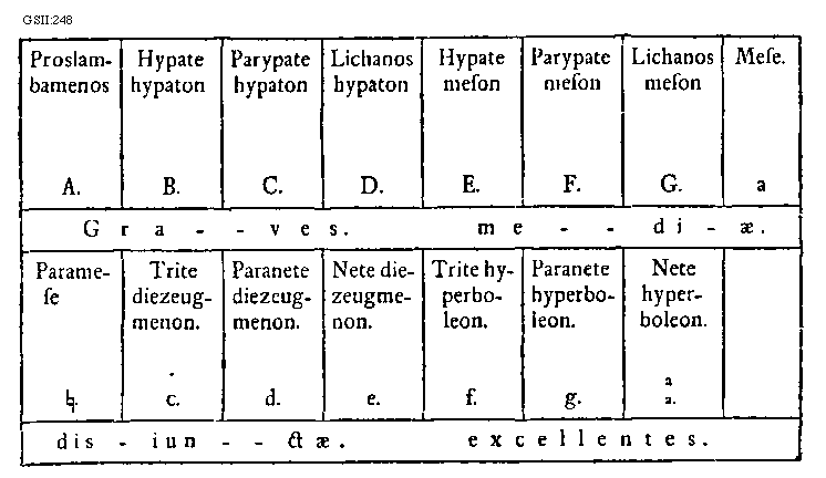 [GSII:248; text: Proslambamenos, Hypate hypaton, Parypate hypaton, Lichanos hypaton, Hypate meson, Parypate meson, Lichanos meson, Mese. Graves. mediae. Paramese, Trite diezeugmenon. Paranete diezeugmenon. Nete diezeugmenon. Trite hyperboleon. Paranete hyperboleon. Nete hyperboleon. disiunctae. excellentes. A. B. C. D. E. F. G. a, [sqb]. c. d. e. f. g. aa.]
