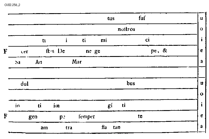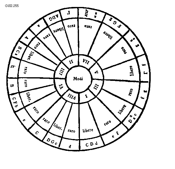[255][GSII:255; raro, libere, Modi, I, II, III, IIII, V, VI, VII, VIII, [Gamma], A, B, C, D, F, G, a, b, [sqb], c, d, e, f, g, aa, [sqb][sqb]]