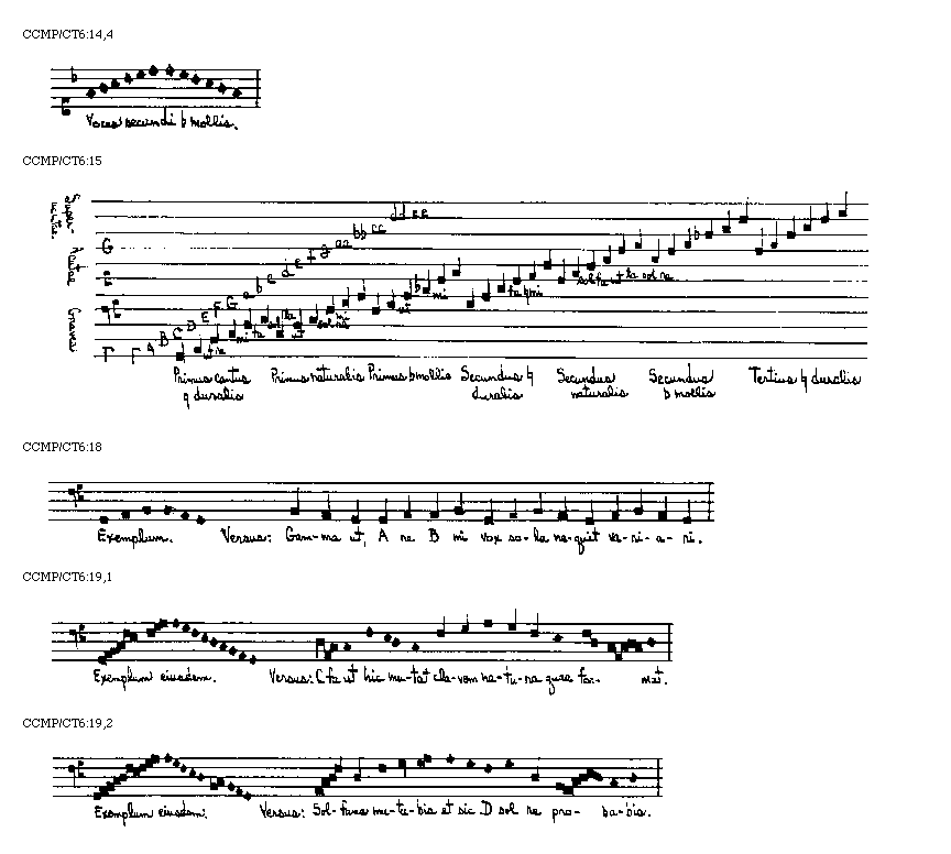 [CCMP/CT6:11; text: Sex voces per quas omnis cantus canitur. Ascensus de ut in alias voces. Descensus de la. Ascensus de re. Descensus de sol. Ascensus de mi. Descensus de mi. Ascensus de fa. Descensus de fa. Descensus per singulas voces. Ascensus et descensus per concordantias. Item alius ascensus et descensus.]