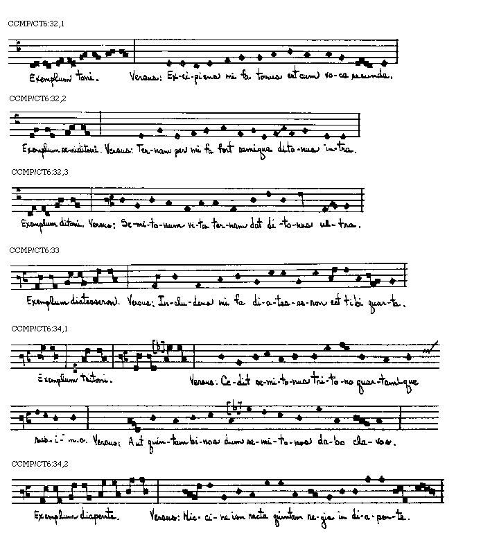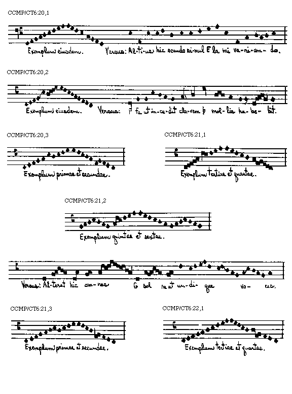 Voces vero sive notae omnium musicorum auctoritate sunt sex, videlicet, ut, re, mi, fa, sol, la, per quas tam in ascensu quam in descensu alterius mutationibus factis omnis cantus sufficientissime decantatur.