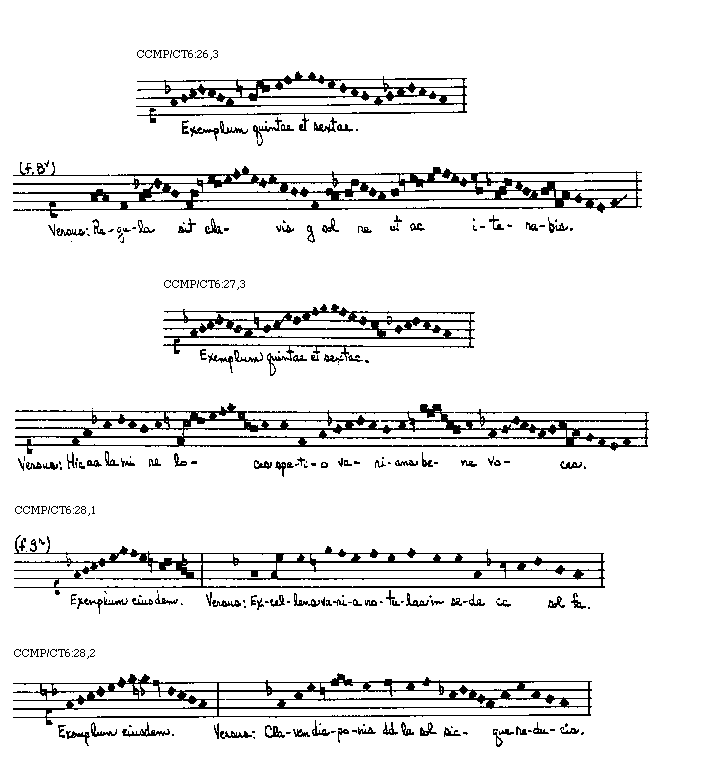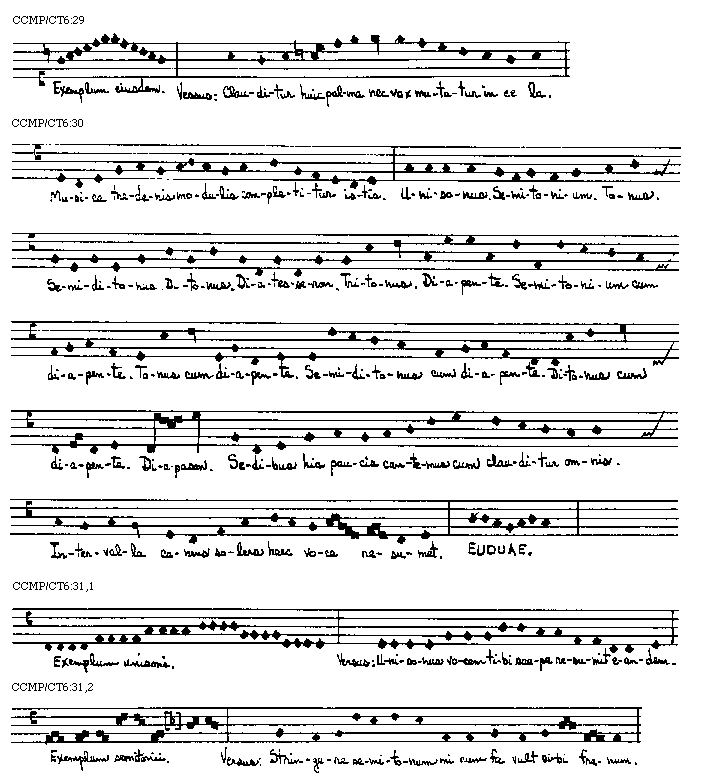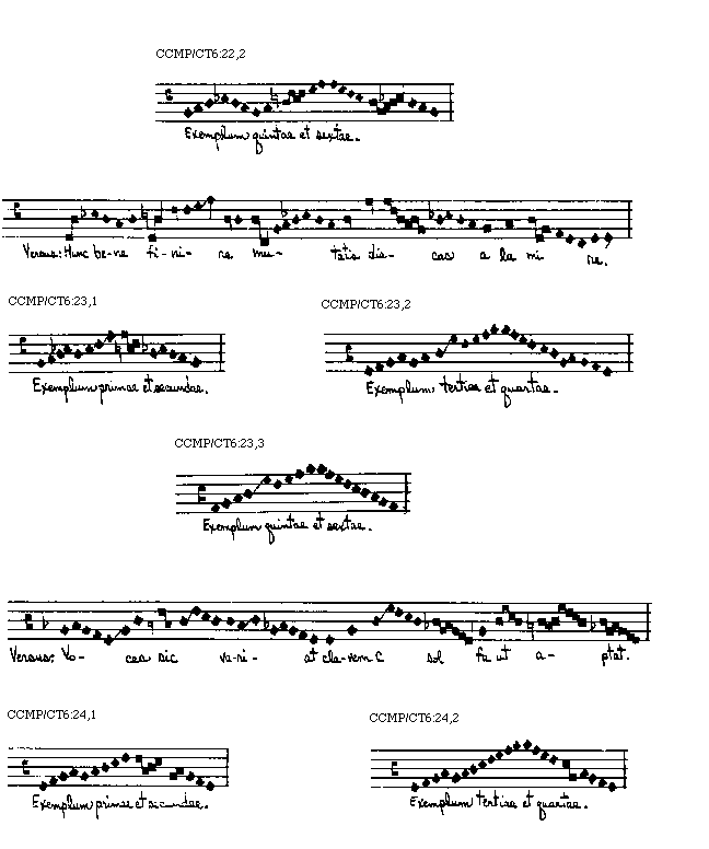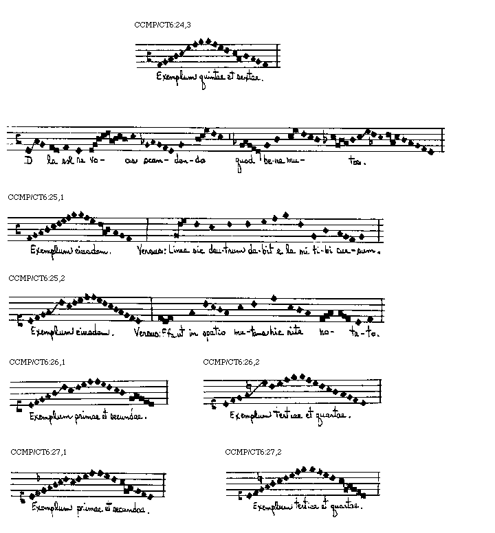 Placet in tractatu praesenti huius artis doctrinam tradere per exempla, quoniam optimus modus demonstrationis est exemplorum positis. Iuxta illud Senecae ad Lucillum longum iter per praecepta breve et efficit per exempla. Itaque ab exemplo manuali incipiens reliqua, sancti spiritus annuente, gratia exemplorum speculationibus reserabo ut discentes non solum ad peritiam canendi cantus editos promoveantur, sed etiam si placuerit inducentur ad inveniendum et componendum de novo super quocumque tonorum, antiphonas seu alias cantus iuxta exigentiam regulares.