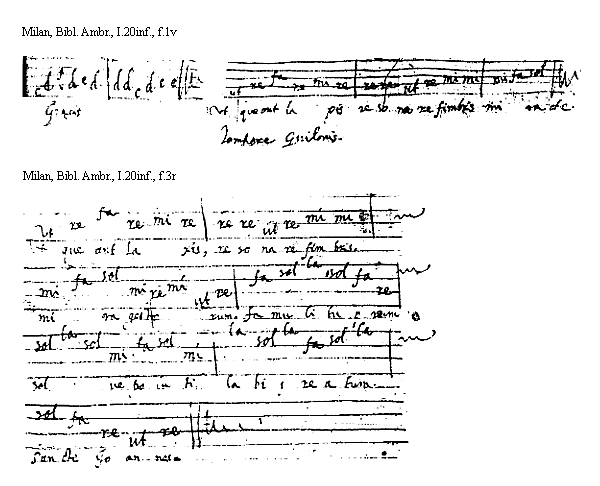 [Milan, Bibl. Ambr., I.20.inf., f.3r; text: vt, ut, re, mi, fa, sol, la, Vt queant laxis, resonare fimbris. mira gestorum. famuli tuorum solue poluti. labii reatum. Sancte Ioannes. m. alt.]