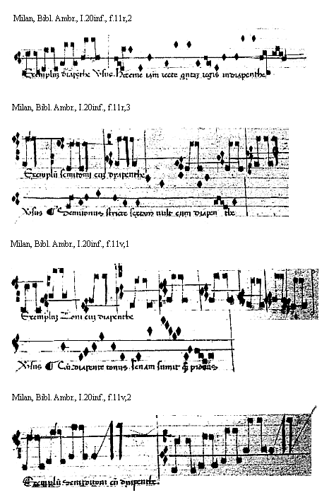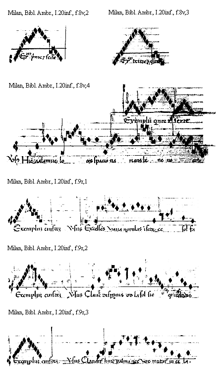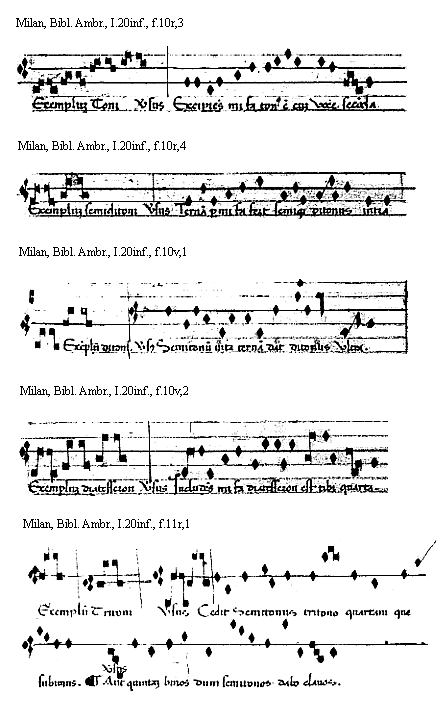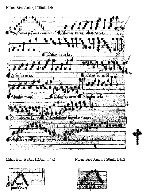 [Milan, Bibl. Ambr., I.20.inf., f.4r; text: Sex voces per quas omnis cantus canitur., Ascensus de vt in alias voces., Descensus de la., Ascensus de re., Descensus de sol., Ascensus de mi., Descensus de mi, Ascensus de fa., Descensus de fa., Descensus per singulas voces., Ascensus et descensus per concordantias., Item alius ascensus et descensus.]