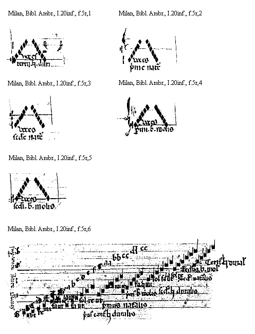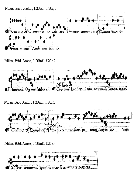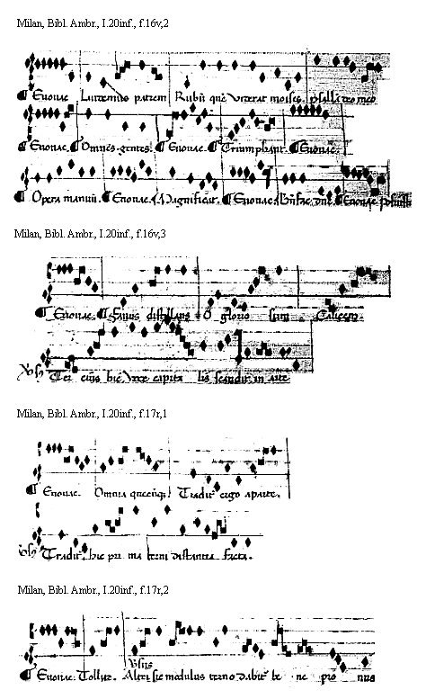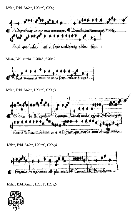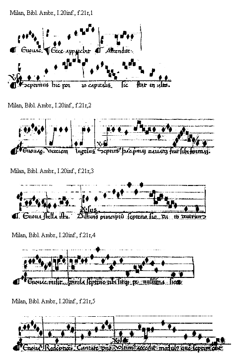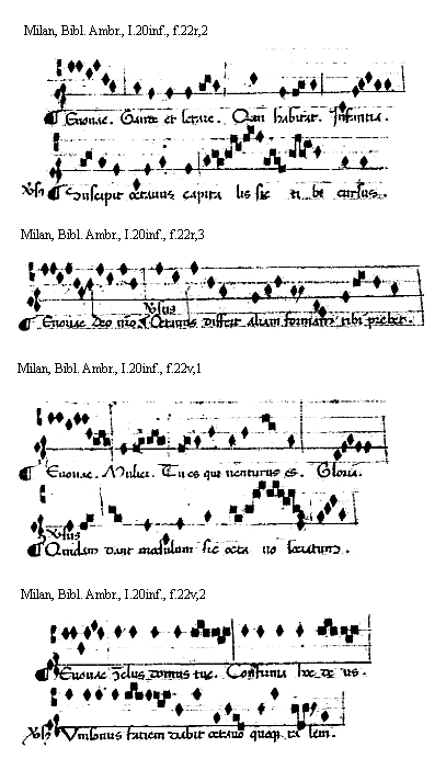 [Milan, Bibl. Ambr., I.20.inf., f.22v,1; text: Euouae. Mulier. Tu es qui uenturus es. Gloria. versus Quidam dant modulum sic octauo sociatum.]