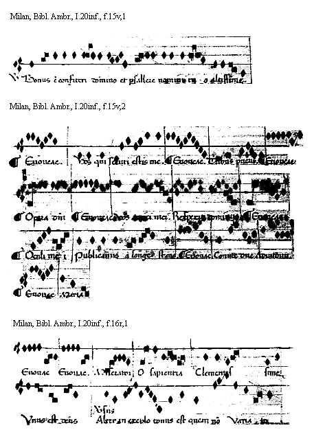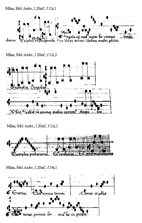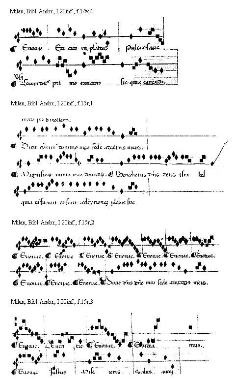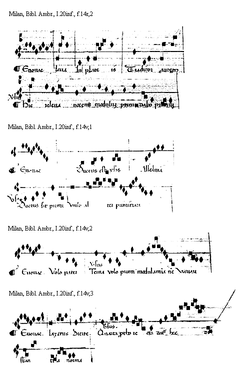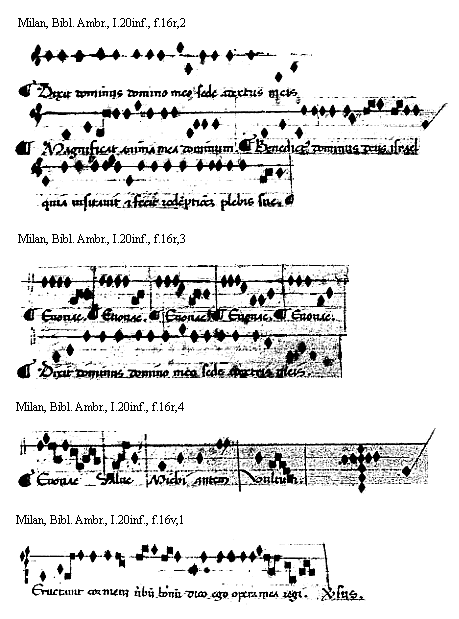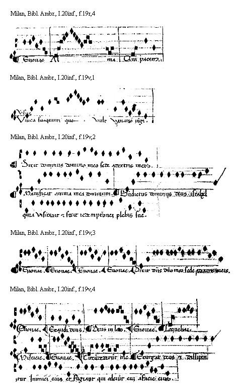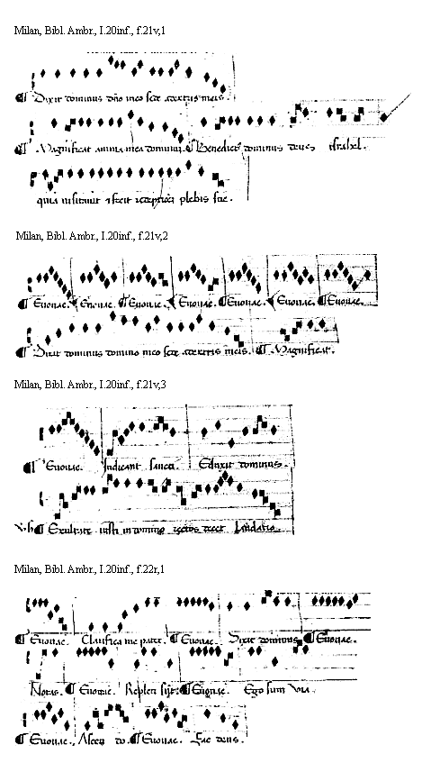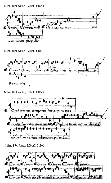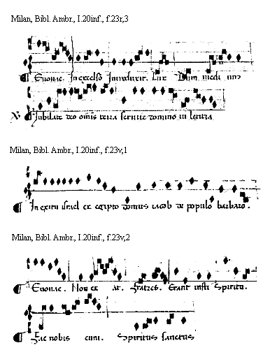 [Milan, Bibl. Ambr., I.20.inf., f.23r,3; text: Euouae. In excelso Introduxit. Lux, Dum medium, versus Iubilate deo omnis terra seruite domino in letitia]