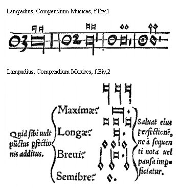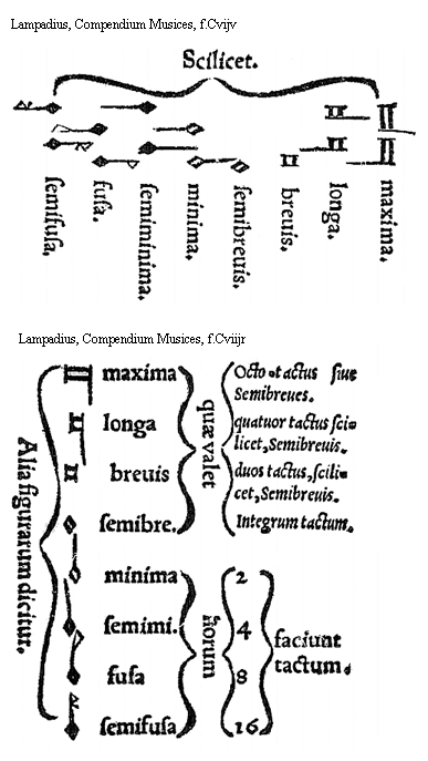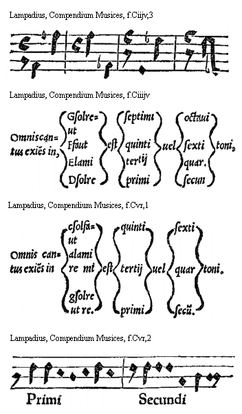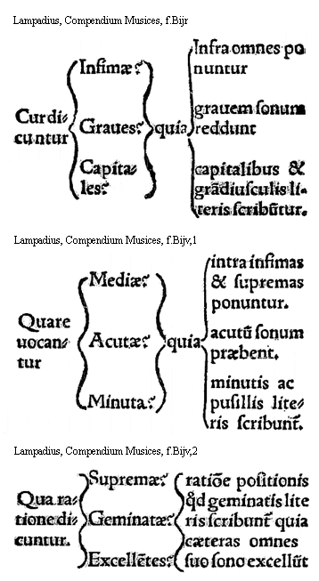 [Lampadius, Compendium Musices, f.Bijv,2, text: Qua ratione dicuntur. Supremae? Geminatae? Excellentes? ratione positionis quod geminatis literis scribuntur quia caeteras omnes suo sono excellunt]