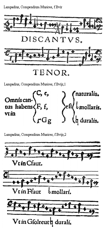 [Lampadius, Compendium Musices, f.Biiijr; text: c, f, [Gamma], dd, G, g, et alia per multa.]