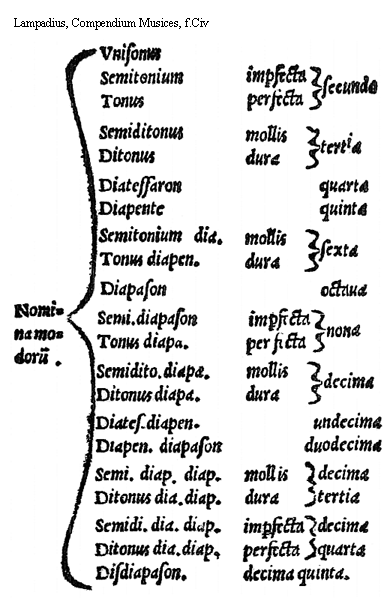 Quomodo reliquae ex dictis componuntur? ab unisono componitur diapason et disdiapason, quae omnes perfectae sunt. A quinta componitur diapente diapason, et diapente disdiapason, quae etiam perfectae sunt. A tertia construuntur ditonus diapason, et ditonus disdiapason. A sexta autem conflantur tonus diapente