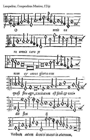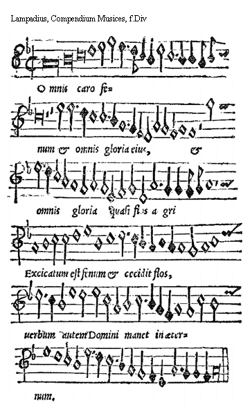 [Lampadius, Compendium Musices, f.Bvv; text: Amice quomodo huc intrasti. re, la]