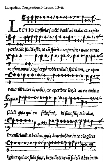 [Lampadius, Compendium Musices, f.Gvijv; text: LECTIO Epistolae sancti Pauli ad Galatas: capite tertio. Sic stulti estis, ut cum spiritu coeperitis: nunc carne consumamini. Qui ergò uobis tribuit spiritum, et operatur uirtutes in uobis, ex operibus legis an ex auditu fidei? quia qui ex fide sunt, hi sunt filij Abrahae. Praenuntiauit Abrahae, quia benedicentur in te omnes gentes, Igitur qui ex fide sunt, benedicentur cum fideli Abraham.]