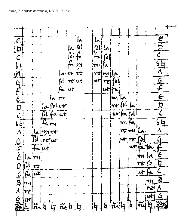 [Siena, Biblioteca comunale, L.V.30, f.16v; text: ut, re, mi, fa, sol, la, A, B, C, D, E, F, G, b[sqb], natura, b, [sqb], quadratum]