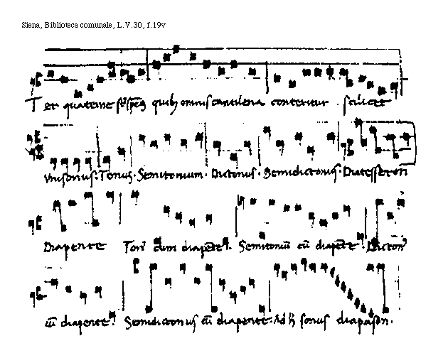 [f.19v][Siena, Biblioteca comunale, L.V.30, f.19v; text: Ter quaterne sunt species quibus omnis cantilena conteritur. scilicet Vnisonus. Tonus. Semitonium. Dictonus. Semidictonus. Diatesseron Diapente Tonus cum diapente. Semitonium cum diapente. Dictonus cum diapente. Semidictonus cum diapente. Ad haec sonus diapason.]