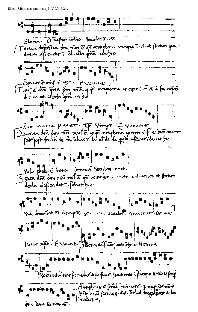 [f.21v][Siena, Biblioteca comunale, L.V.30, f.21v; text: Gloria O pastor eterne. Seculorum amen. Tertia differentia primi modi est quando antiphona incipit in .D. et statim gradatim ascendit in sol. uerbi gratia. ut hic. Cognouerunt omnes. Euge. EVouae. Talis est differentia quarta primj modi. quod quando antiphona incipit in .F. et a fa descendit in ut. Verbi gratia ut hic, Aue Maria. Pater. Christi uirgo EVouae, Quinta differentia primi modi talis est, quod quando antiphona incipit in .F. et statim .mi. re sequitur post .fa. uel de .fa. saliat in .la. uel de .fa. per .sol. ascendat in .la. ut hic. Volo pater. Estote. Dominus. Seculorum amen. Sexta differentia primi modi talis est quando antiphona incipit in .A. acuto et statim de. la. descendit in .sol. ut hic. Vidi dominum. Vt non deinquam. Scio cui credibilis. Auitorium. Domine hodie Christe. EVouae. Secundum [Secundus ante corr.] autem simile est huic. Neuma, Secundus tonus sic mediatur et sic finitur. Sicut erat in principio et nunc et semper et in secula seculorum amen. Antiphone uero secundj modi, utcumque incipiantur. tantummodo habent unum seculorum amen. preter ad magnificat et benedictus.]