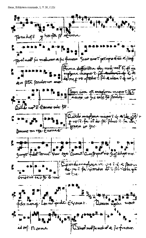 [f.23r][Siena, Biblioteca comunale, L.V.30, f.23r; text: Quintus modus sic mediatur et sic finitur. Sicut erat in principio et nunc et semper et in secula seculorum amen. Omnes antiphone quinti modj unicum habent tantummodo seculorum preter hanc antiphonam. Alma redemptoris mater quae cantatur ad magnificat, quae differentia hic patet. Sexta hora sedit super puteum. Euouae. Sextus modus sic mediatur et sic finitur. Neuma, Sicut erat in pricipio et nunc et semper, et in secula seculorum amen, Omnes antiphone sexti modi tam autenticales quam collaterales unum habent tantummodo seculorum. uerbi gratia ut hic, Septem sunt spiritus ante tronum dei. Neuma, Septimus modus sic mediatur et sic finitur. Sicut erat in principio et nunc et semper et in secula seculorum amen. Quando antiphona septimi modi incipit in .G. non statim saliendo in diapente sed melodion ascendendo perficiente. uerbi gratia ut hic. Descendi in ortum meum. Pontifices. Sapientiam. Euouae talis habet.]