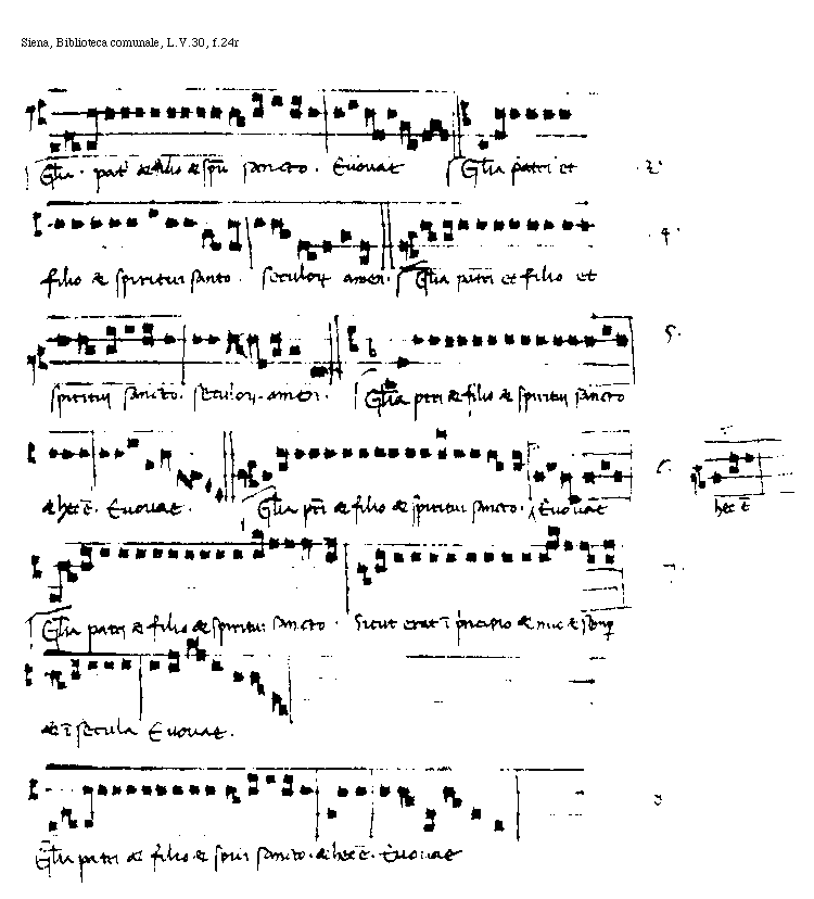 [f.24r][Siena, Biblioteca comunale, L.V.30, f.24r; text: 2. Gloria. patri et filio et spiritu sancto. Euouae. 3. Gloria patri et filio et spiritui santo. seculorum amen. 4. 5. Gloria patri et filio et spiritui sancto et hec est. 6. Sicut erat in principio et nunc et semper et in secula Euouae.]