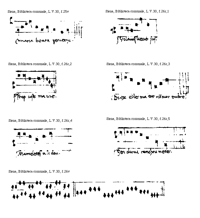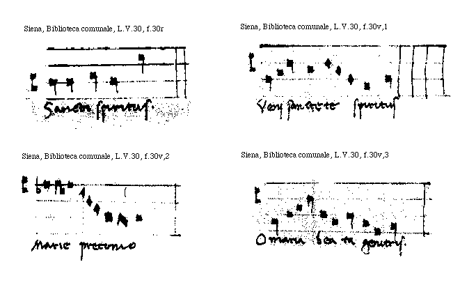 [Siena, Biblioteca comunale, L.V.30, f.30v,3; text: O Maria beata genitris.]