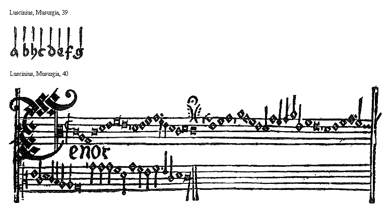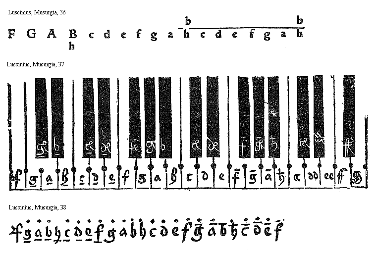 [Luscinius, Musurgia, 36; text: F, G, A, B, c, d, e, f, g, a, b, h]