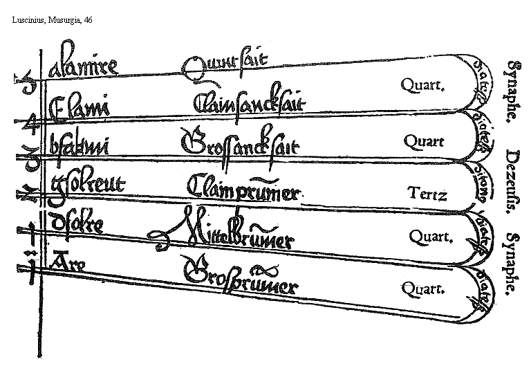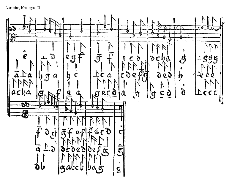 [Luscinius, Musurgia, 37; text: f, g, a, b, c, d, e, h, cc, dd, ee, ff, gg]