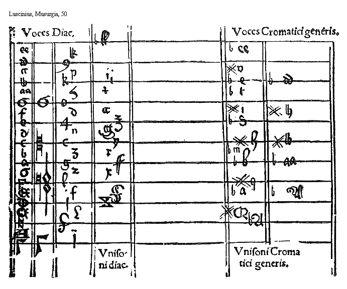 [50][Luscinius, Musurgia, 50; text: Voces Diatonicae, Vnisoni diatonici, Voces Cromatici generis. Vnisoni Cromatici generis. A, C, D, E, F, G, a, b, c, d, e, f, g, aa, bb, cc, dd, ee, 2, 3, 4, 5]