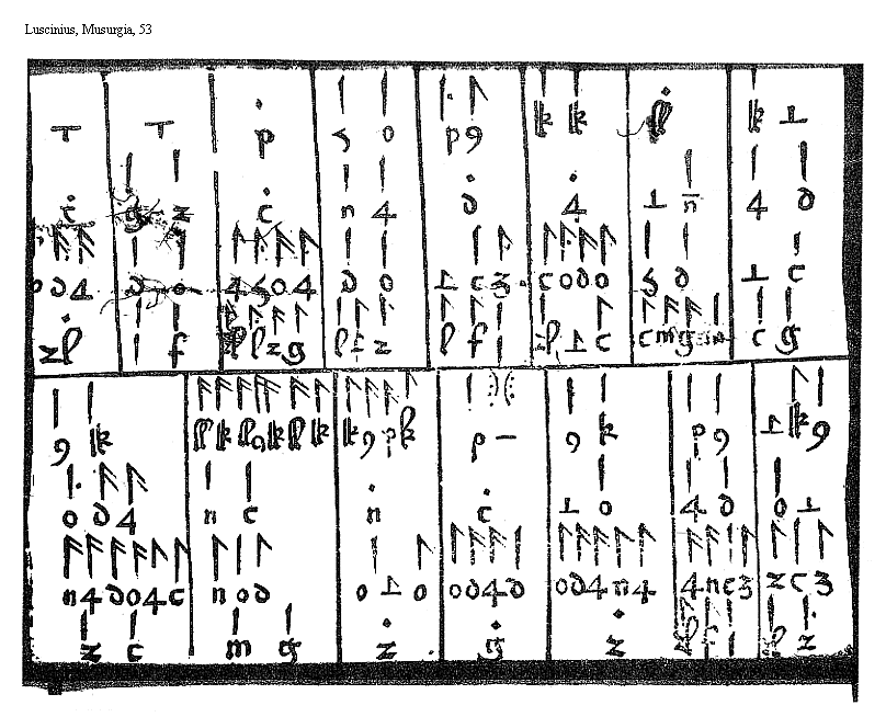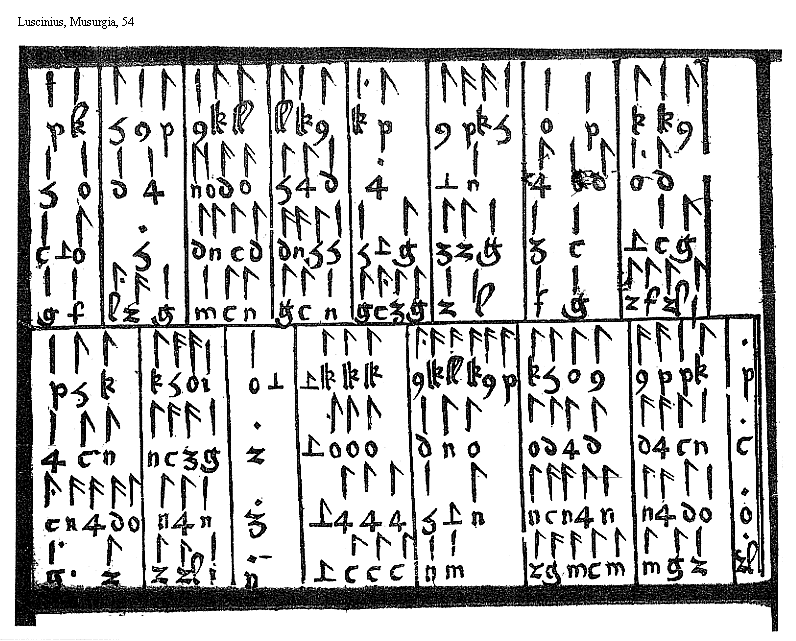 [48][Luscinius, Musurgia 48; text: 1, 2, 3, 4, 5, A, a, b, c, d, e, f, g, h, i, k, L, l, m, n, o, p, Q, q, r, s, t, v, X, x, y, z, AA, aa, bb, cc, dd, ee, ff, gg, hh, ii, kk]