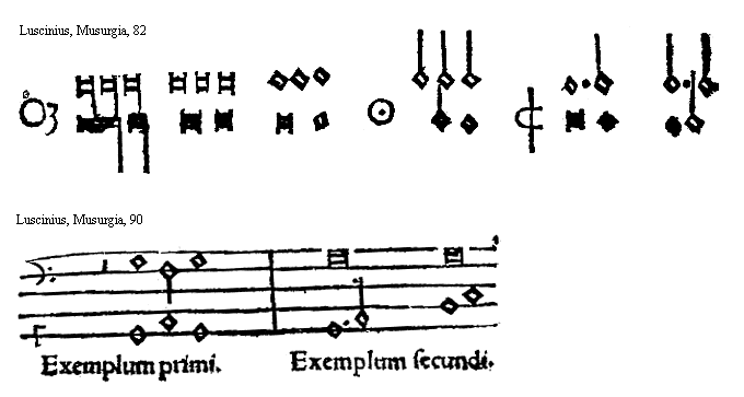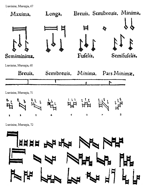 [Luscinius, Musurgia, 68; text: Breuis. Semibreuis. Minima. Pars Minimae.]