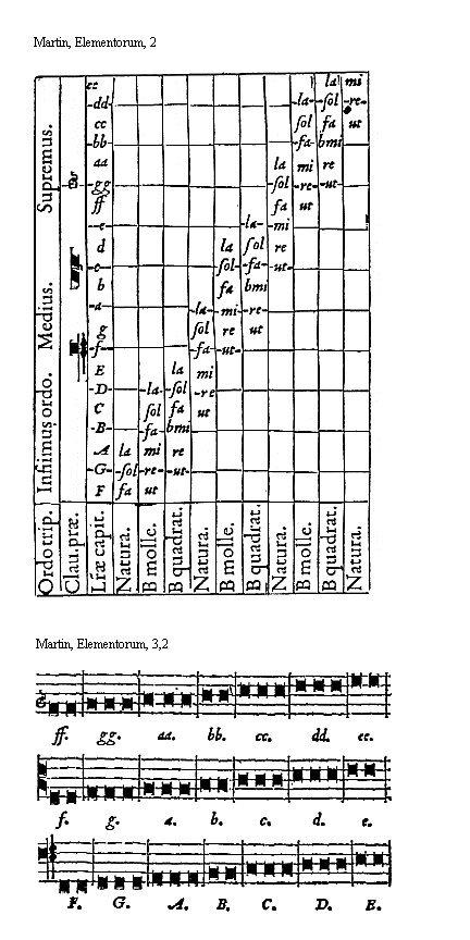 [Martin, Elementorum, 2; text: Supremus, Medius, Infiimus ordo, Ordo triplus, Claues praecipuae, Litterae capitales, Natura, B molle, B quadratum, ee, dd, cc, bb, aa, gg, ff, e, d, c, b, a, g, f, E, D, C, B, A, G, F, la, sol, fa, mi, re, ut, bmi]