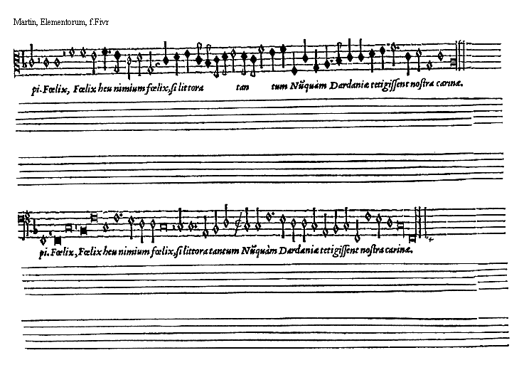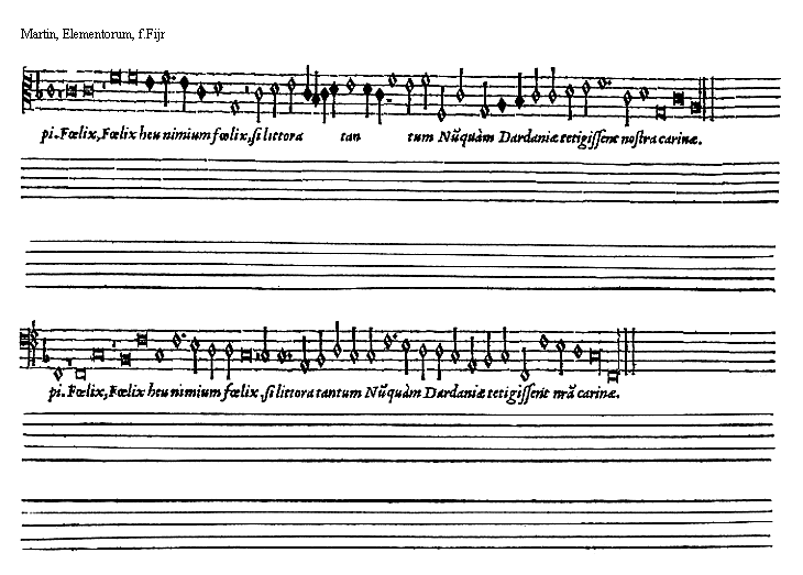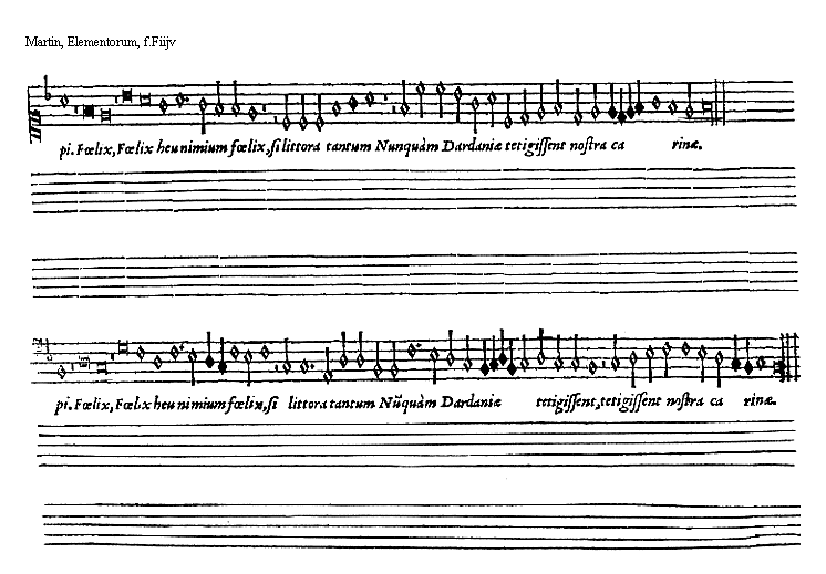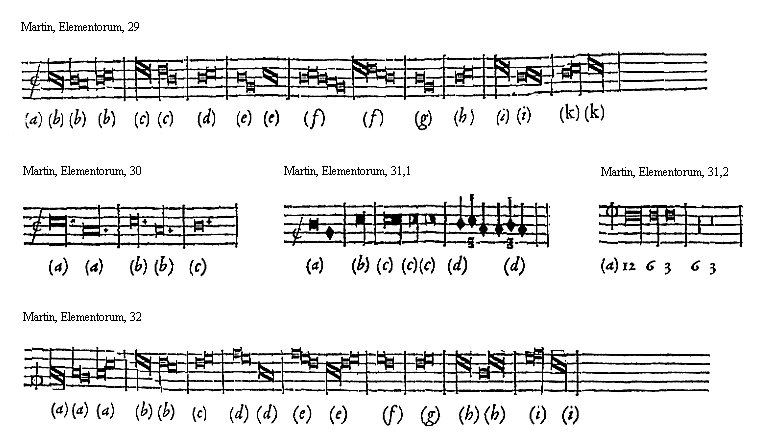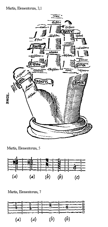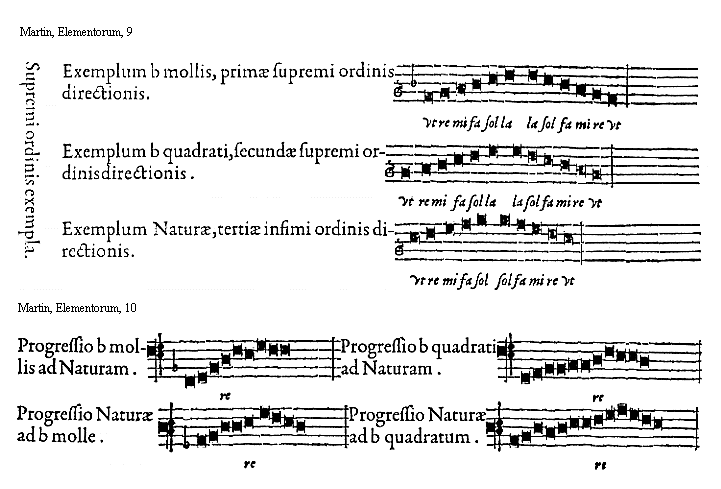 [9][Martin, Elementorum, 9; text: Supremi ordinis exempla. Exemplum b mollis, primae supremi ordinis directionis. b quadrati, secundae. Naturae, tertiae infimi. vt, re, mi, fa, sol, la]