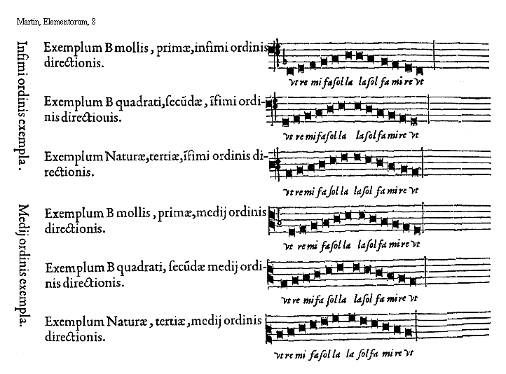 [8][Martin, Elementorum, 8; text: Infimi ordinis exempla. Exemplum B mollis, primae, infimi ordinis directionis. Exemplum B quadrati, secundae, infimi ordinis directiouis. Naturae, tertiae. Medij ordinis exempla. vt, re, mi, fa, sol, la]