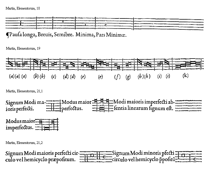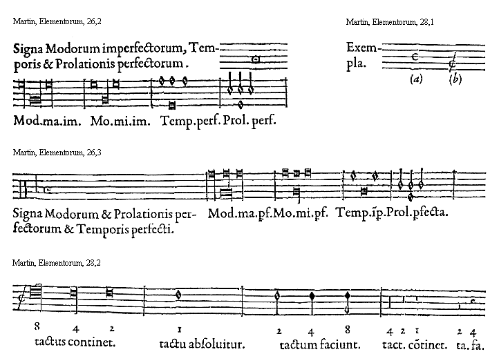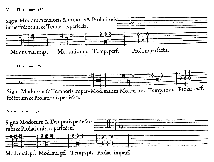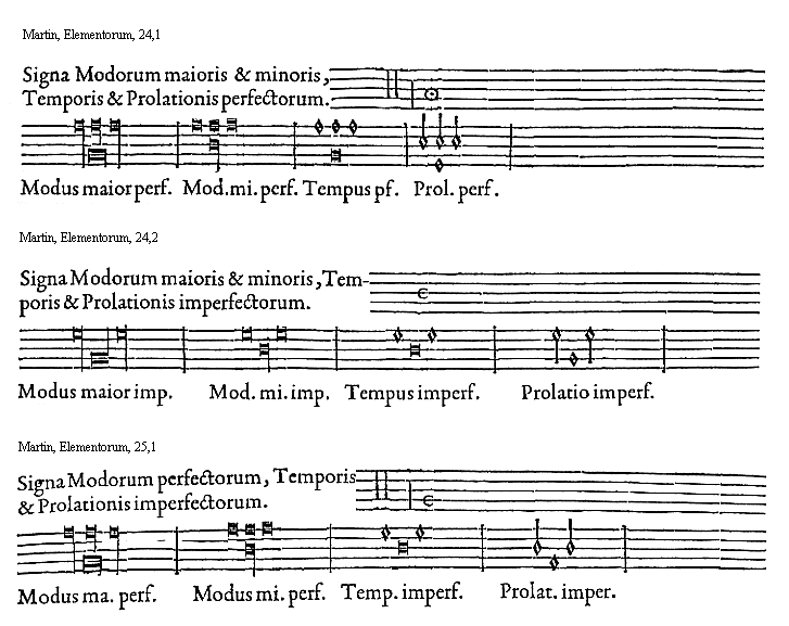 [25][Martin, Elementorum, 25,1; text: Signa Modorum perfectorum, Temporis et Prolationis imperfectorum. Modus maior perfectus. Modus minor perfectus. Tempus imperfectum. Prolatio imperfecta.]