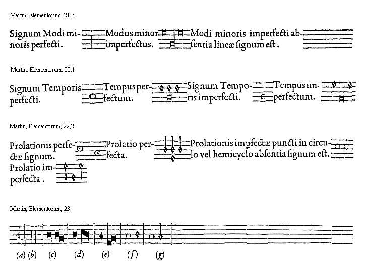 [Martin, Elementorum, 22,2; text: Prolationis perfectae signum. Prolatio perfecta. Prolationis imperfectae puncti in circulo vel hemicyclo absentia signum est. Prolatio imperfecta.]