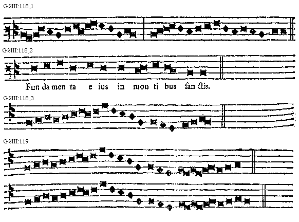 Chorda namque primi et eius plagalis est F. grave: tertii et eius plagalis G. grave: quinti et eius plagalis a acutum: septimi et eius plagalis [sqb] secundum acutum. Sed dicet aliquis unus cantus formatur ex speciebus communibus diatessaron et diapente, puto sic, quod per has non poterit iudicari; itemque in notis supra et infra chordam positis aequalitas invenitur; quid erit talis cantus? Dicimus, quod plagalis. Cuius ratio est, quia quilibet authenticus gliscit ad suam perfectionem, vel ad partem eius ascendens, et si hoc facere nequit ob sui brevitatem, semper in eo sunt aliquae species vel partes specierum, per quas ipsum possumus authenticum iudicare, ut est haec antiphona: