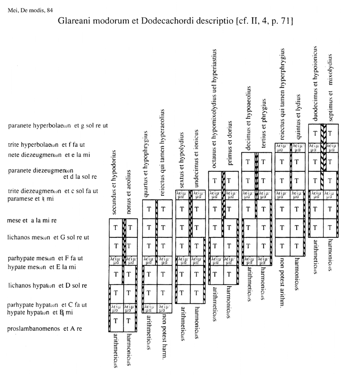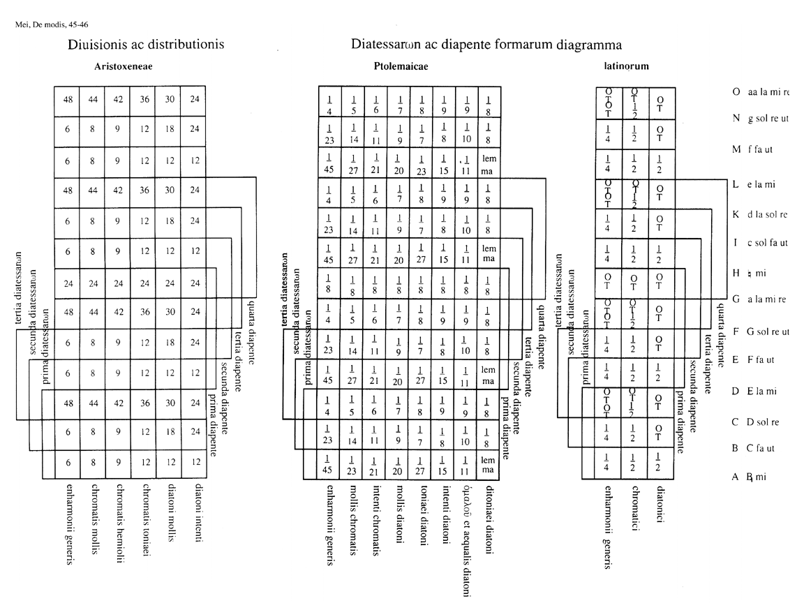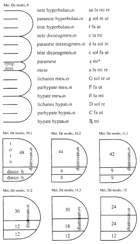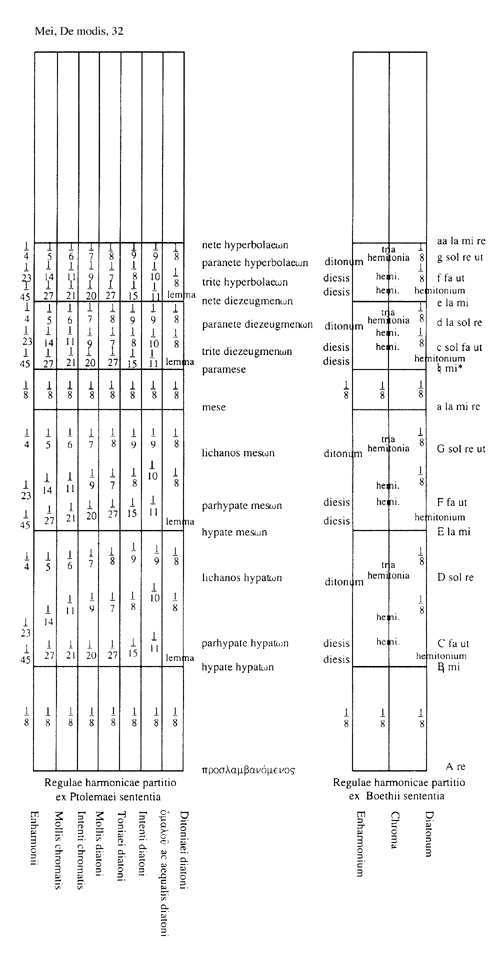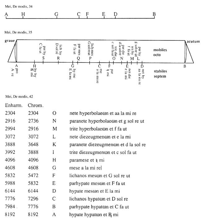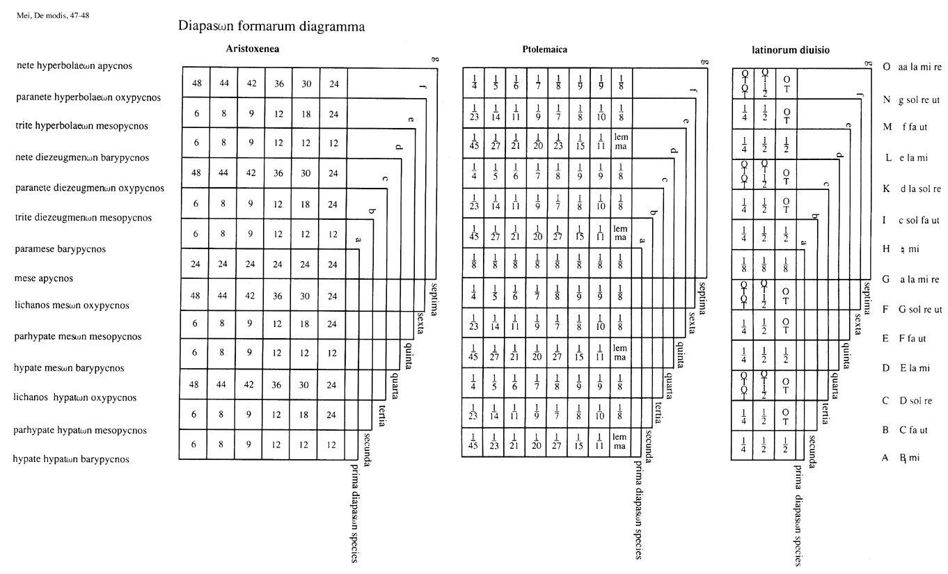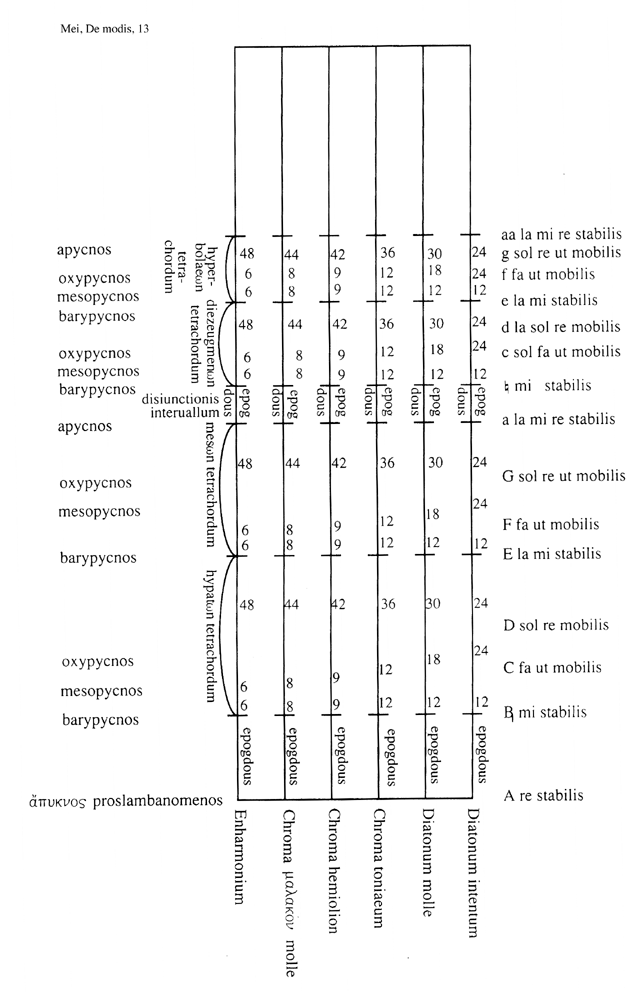 [13][Mei, De modis, 13; text: apycnos, oxypycnos, mesopycnos, barypycnos, [apuknos] proslambanomenos, Diatonum intentum, Diatonum molle, Chroma toniaeum, Chroma hemiolion, Chroma [malakon] molle, Enharmonium, aa la mi re stabilis, g sol re ut mobilis, f fa ut mobilis, e la mi stabilis, d la sol re mobilis, c sol fa ut mobilis, [sqb] mi stabilis, a la mi re stabilis, G sol re ut mobilis, F fa ut mobilis, E la mi stabilis, D sol re mobilis, C fa ut mobilis, B mi stabilis, A re stabilis, hyperbolae[Omega]n tetrachordum, diezeugmen[Omega]n tetrachordum, disiunctionis interuallum, mes[Omega]n tetrachordum, hypat[Omega]n tetrachordum, epogdous, 6, 8, 9, 12, 18, 24, 30, 36, 42, 44, 48]