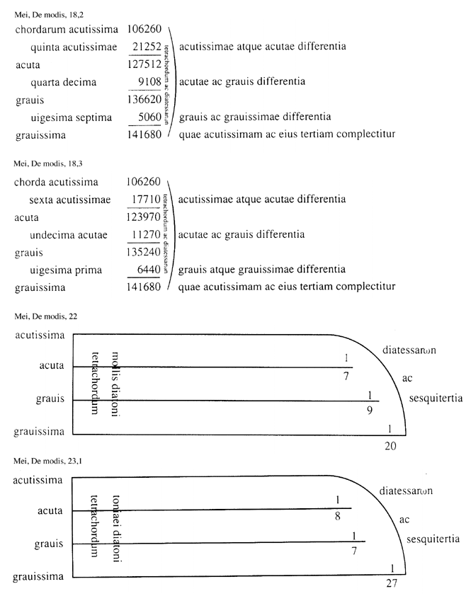 [Mei, De modis, 18,3; text: chorda acutissima, 106260, sexta acutissimae, 17710, acuta, 123970, undecima acutae, 11270, grauis, 135240, uigesima prima, 6440, grauissima, 141680, tetrachordum ac diatessar[Omega]n, acutissimae atque acutae differentia, acutae ac grauis differentia, grauis atque grauissimae differentia, quae acutissimam ac eius tertiam complectitur]