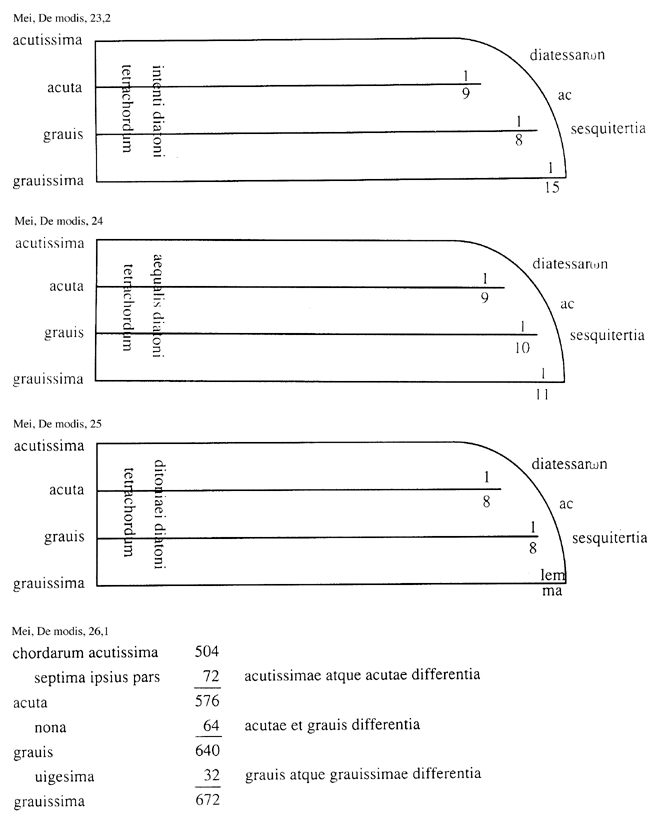 [Mei, De modis, 24; text: acutissima, acuta, grauis, grauissima, aequalis diatoni tetrachordum, 1/9, 1/10, 1/11, diatessar[Omega]n ac sesquitertia]