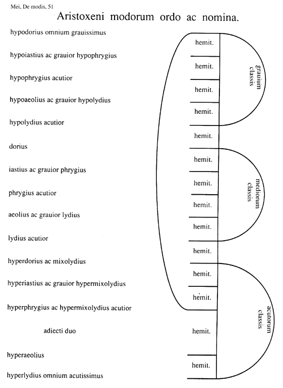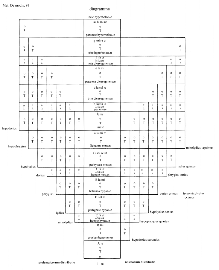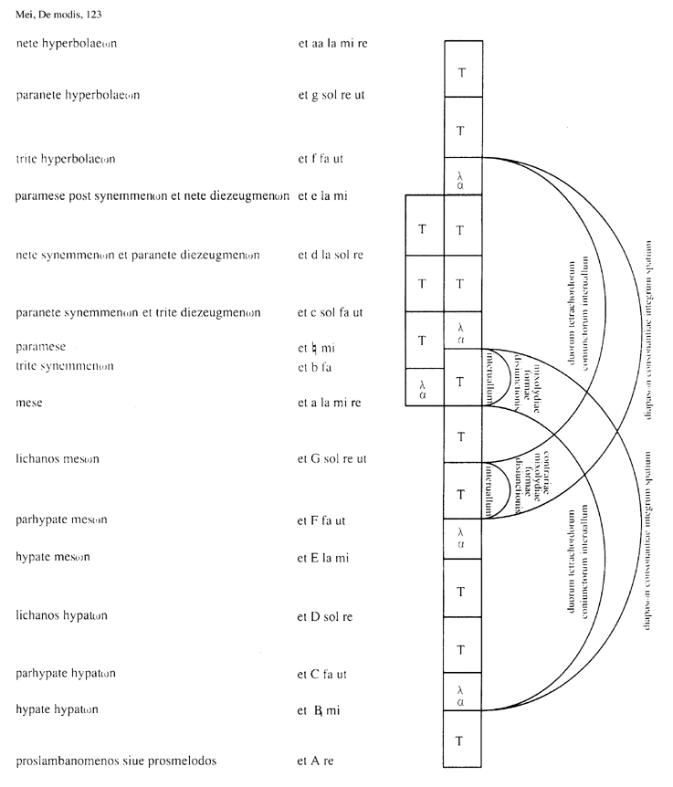 [123][Mei, De modis, 123, text: nete hyperbolae[Omega]n et aa la mi re, paranete hyperbolae[Omega]n et g sol re ut, trite hyperbolae[Omega]n, et f fa ut, paramese post synemmen[Omega]n et nete diezeugmen[Omega]n et e la mi, nete synemmen[Omega]n et paranete diezeugmen[Omega]n et d la sol re, paranete synemmen[Omega]n et trite diezeugmen[Omega]n et c sol fa ut, paramese et [sqb] mi, trite synemmen[Omega]n et b fa, mese et a la mi re, lichanos mes[Omega]n et G sol re ut, parhypate mes[Omega]n et F fa ut, hypate mes[Omega]n et E la mi, lichanos hypat[Omega]n et D sol re, parhypate hypat[Omega]n et C fa ut, hypate hypat[Omega]n et B mi, proslambanomenos siue prosmelodos et A re, Tonus, [leimma], mixolydia formae disiunctionis, interuallum, contrariae mixolydia formae disiunctionis, duorum tetrachordorum coniunctorum interuallum, diapas[Omega]n consonantiae integrum spatium]