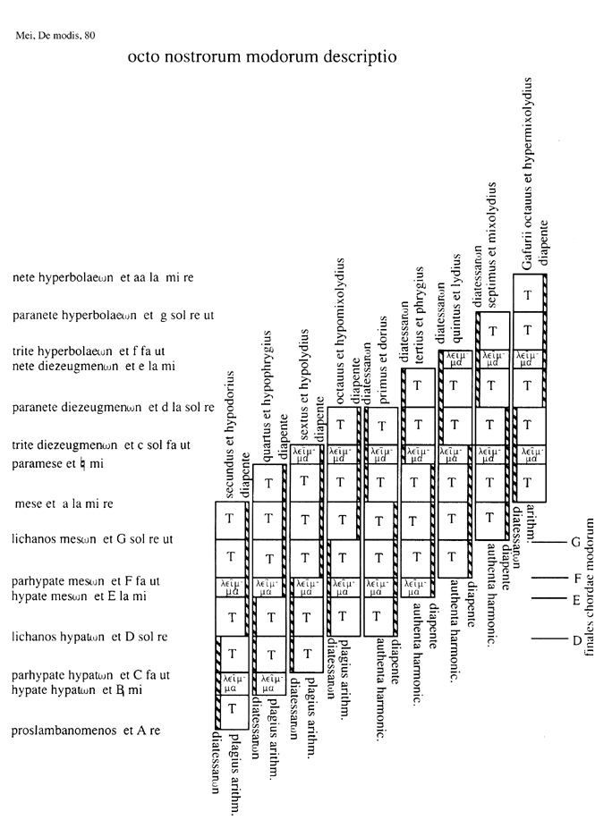 [8][Mei, De modis, 8; text: epogdous, nete hyperbolae[Omega]n, aa la mi re, paranete hyperbolae[Omega]n, g sol re ut, trite hyperbolae[Omega]n, f fa ut, nete diezeugmen[Omega]n, e la mi, paranete diezeugmen[Omega]n, d la sol re, trite diezeugmen[Omega]n, c sol fa ut, paramese, [sqb] mi, mese, a la mi re, lichanos mes[Omega]n, G sol re ut, parhypate mes[Omega]n, F fa ut, hypate mes[Omega]n, E la mi, lichanos hypat[Omega]n, D sol re, parhypate hypat[Omega]n, C fa ut, hypate hypat[Omega]n, B mi]