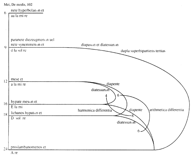 [Mei, De modis, 102; text: nete hyperbolae[Omega]n et aa la mi re, paranete diezeugmen[Omega]n uel nete synemmen[Omega]n et d la sol re, diapas[Omega]n et diatessar[Omega]n, dupla superbipartiens tertias, mese et a la mi re, diapente, diatessar[Omega]n, harmonica differentia, arithmetica differentia, hypate mes[Omega]n et E la mi, lichanos hypat[Omega]n et D sol re, proslambanomenos et A re, 4, 6, 8, 9, 12, 16, 18, 24]