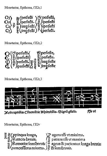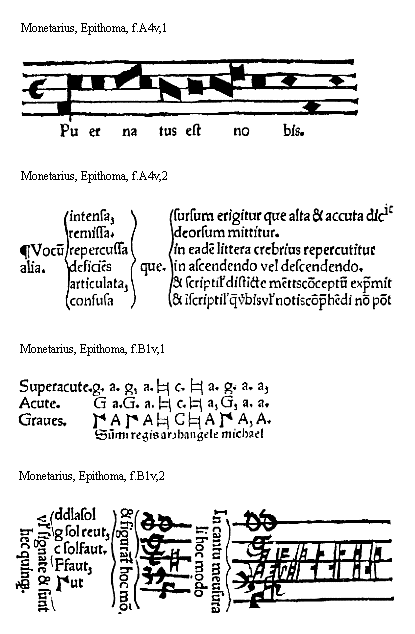 [Monetarius, Epitoma, f.B1v,1; text: Superacute, Acute, Graues, g. a. c. G. [Gamma], A, C, Summi regis archangele michael]