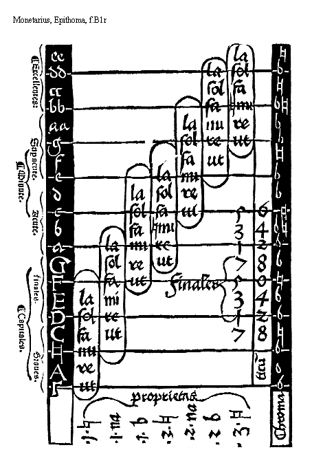 [Monetarius, Epitoma, f.B1r; text: Excellentes: Minute, Superacute, Acute, Capitales, finales, Graues, ee, dd, cc, bb, aa, g, f, e, d, c, b, a, G, F, E, D, C, A, [Gamma], la, sol, fa, mi, re, ut, Finales, 7, 5, 3, 1, 6, 4, 2, 8, 0, Chromaticum, proprietas]