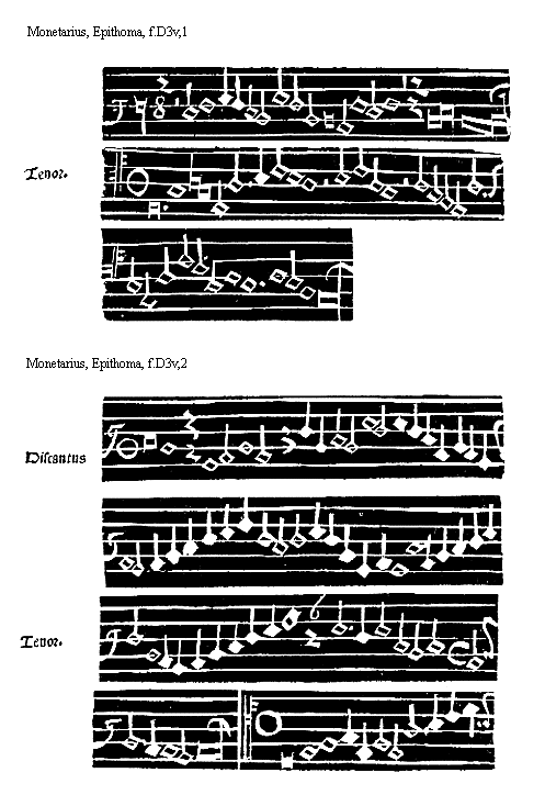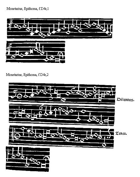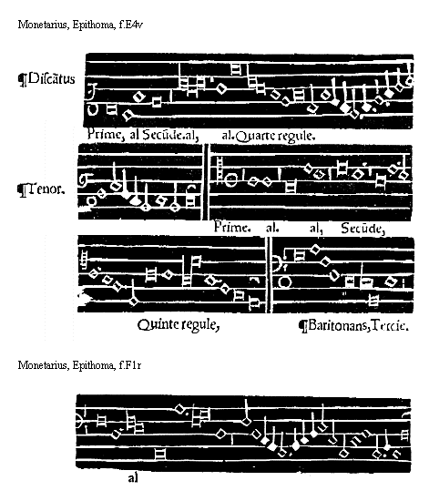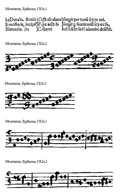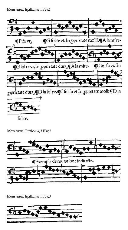 [f.B2v][Per mutatio in marg.] potius permutatio generabitur. Est igitur permutatio authore Franchino: mutua qualitatis et quantitatis inuicem variatio, qualis in bfa[sqb]mi committi potest: sed hanc omni solertia musicorum scola deuidandam [Mutatio explicita. in marg.] precepit. Mutationum alia explicita totalis: vbi ambe sillabe exprimuntur, explicira partialis vbi vna solum effertur sillaba, ab illa instituentibus erit inchoandum in hac autem omni studio perseueram [Directa. Indirecta in marg.] dum: directa enim efficitur cum fit sillabarum ordinis in alium ordinem variatio vt superioris in inferiorem et econtra: Indirecta cum fit vnius sillabe in aliam eiusdem ordinis variatio. vt superioris in superiorem. et inferioris in inferiorem: hec impropria dicitur mutatio que a musicis: ob euitandam [Reductius mutatio. in marg.] permutationem est excogitata, alia reductiuaquum monosillabe aut disillabe necessitatis gratia ad earum dyapason reducuntur: de mutationibus huiusmodi seruabuntur mandata: et primo de initio cantus [De inicio cantus mandatum primum in marg.] Omnis cantus qui post inicialem eius notulam eleuatur: circa principium non statim ditonice vel semiditonice aut grauius descendens: ab inferiore voce inchoabitur vt his conspicitur exemplis. [Exempla regule. in marg.]
