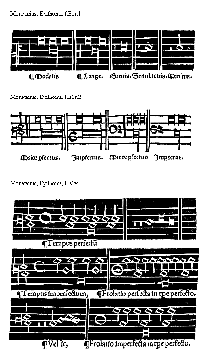 Nempe veneranda vetustas varijs notularum characteribus cantum designabat: qui licet specie discernuntur vna tamen tactus quantitate metiuntur. quare huc vsque omnes fere contemplatorum codices inbutissimi videntur, ideo non indignum arbitor eas ipsas notulas nostro inserere opusculo. vt si quem preter opinionem accesserint easdem procul hesitatione cognoscat: sunt autem hee figure sequentes.